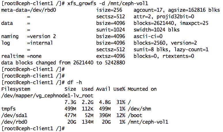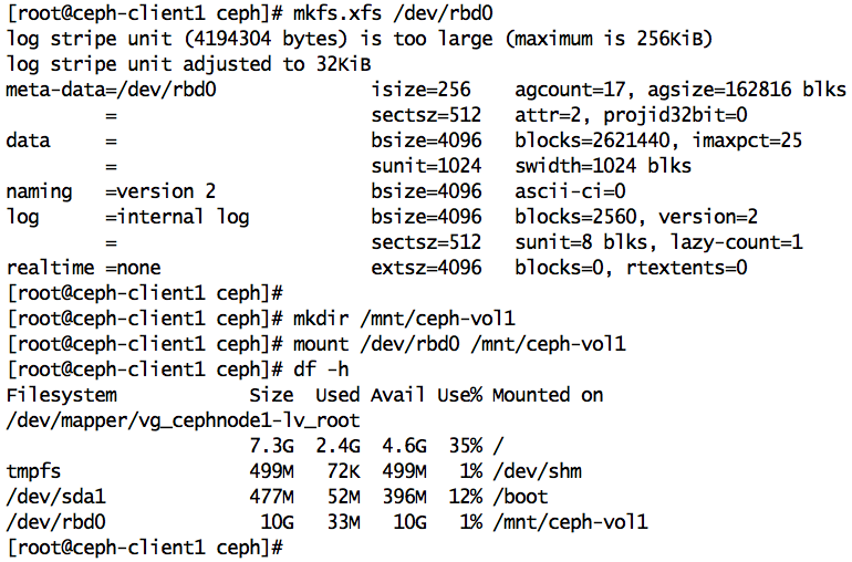 # mount /dev/rbd0 /mnt/ceph-vol1