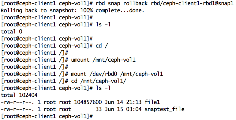 # rbd snap rollback rbd/ceph-client1-rbd1@snap1
