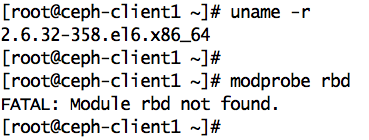 在本章的前面,我们创建了一个RBD镜像在Ceph集群,为了使用这个块设备的镜像,我们需要将它映射到客户机。让我们看看如何执行映射操作。 Linux 2.6.32内核版本支持ceph,客户机需要本地可以访问Ceph块设备和文件系统,建议使用Linux内核版本2.6.34或者更新的版本。 检查Linux内核版本以及使用modprobe命令支持RBD的使用,由于这个客户端运行在Linux内核中的旧版本,它不支持Ceph的原生。