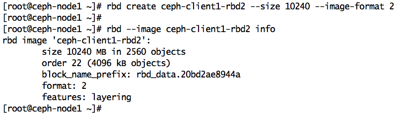# rbd create ceph-client1-rbd2 --size 10240 --image-format 2