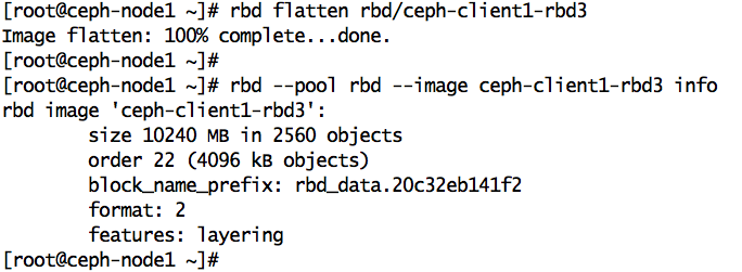 此时,你要一个克隆的RBD镜像,取决于其父镜像快照。如果使克隆的RBD镜像独立于其父镜像,你需要flatten这个镜像,这其中包括将数据从父快照复制到子镜像,完成flatten过程所需的时间取决于父快照中的数据的大小。一旦flatten过程完成后,我们克隆的RBD镜像及父快照之间就没有关系了。让我们真正来执行下flatten: