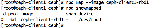 Map RBD镜像ceph-client1-rbd1到ceph-client1主机,由于现在的Linux内核的RBD的原生支持,你可以在ceph-client1上执行下面的RBD map命令: