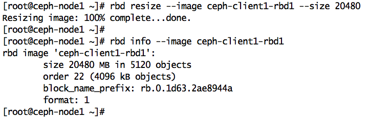 # rbd resize rbd/ceph-client1-rbd1 --size 20480