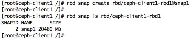 # rbd snap create rbd/ceph-client1-rbd1@snap1